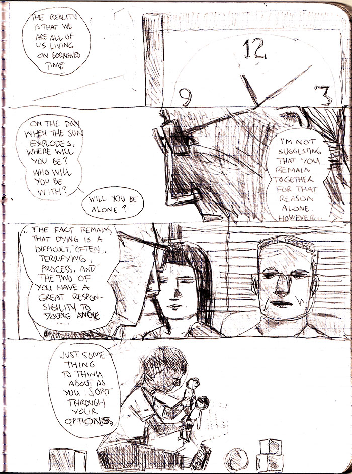 I worked on FIVE YEARS for not quite five years, though certainly it consumed several years of my creative life. For a time I quite enjoyed it. For a time it satisfied my creative needs, and I guess that was good enough. Looking back at it now, I remain satisfied with, though not especially proud of, many of the pages, and I’ll likely post them here if for no other reason than to have a published record of them.